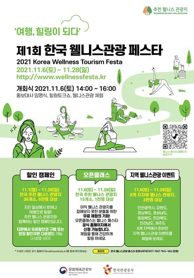 문화체육관광부는 한국관광공사와 함께 ‘여행, 치유(힐링)가 되다’를 주제로 11월 6일부터 28일까지 전국 곳곳에서 ‘제1회 한국 웰니스관광 페스타’를 개최한다.