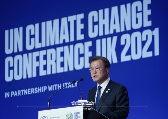 문 대통령은 "첫째, 한국은 2030 NDC를 상향하여 2018년 대비 40% 이상 온실가스를 감축하고 ‘국제메탄서약’에 가입해 메탄 감축 노력에 적극 동참하겠다, 둘째, 한국은 2차 세계대전 이후 유일하게 산림녹화에 성공한 나라로서 산림복원 협력에 앞장서겠다, 셋째, 세계 석탄 감축 노력에 동참하고 개도국들의 저탄소 경제 전환에 적극 협력하겠다"고 밝혔다.