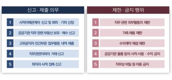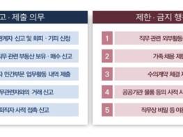 이해충돌방지법은 공직자의 부당한 사익추구 행위를 금지하고 공정한 직무수행을 보장하고자 사적이해관계자 신고·회피 의무, 부동산 보유·매수 신고 의무, 고위공직자 가족의 채용 및 수의계약 체결 제한 등 10가지 행위기준을 담고 있다.