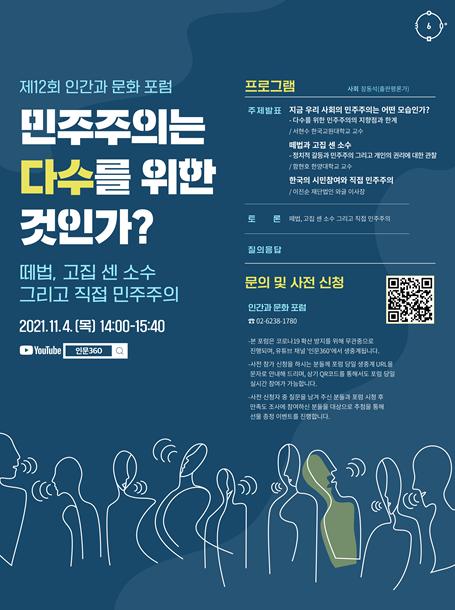 문화체육관광부는 한국출판문화산업진흥원(이하 진흥원)과 함께 11월 4일 오후 2시, ‘민주주의는 다수를 위한 것인가? - 떼법, 고집 센 소수 그리고 직접 민주주의’를 주제로 열두 번째 ‘인간과 문화 포럼’을 개최한다.