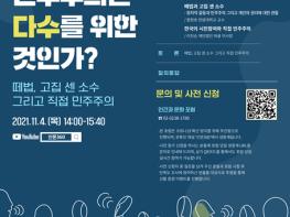 ▲ 한국교원대학교 서현수 교수가 ‘지금 우리 사회의 민주주의는 어떤 모습인가?’를 주제로 발표하고, ▲ 한양대학교 함현호 교수는 ‘떼법과 고집 센 소수’를, ▲ 재단법인 와글 이진순 이사장은 ‘한국의 시민 참여와 직접 민주주의’를 이야기한다. 이후 발표자들은 ‘떼법과 고집 센 소수 그리고 직접 민주주의’를 주제로 종합 토론을 이어간다.