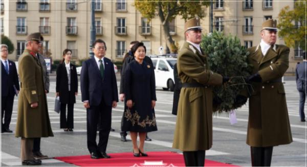 헝가리를 국빈방문 중인 문재인 대통령은 11월 3일 오전(현지시각) 대통령궁 공식환영식에 앞서 영웅광장을 방문했다.