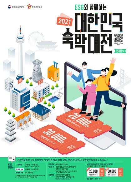 문화체육관광부는 한국관광공사와 함께 단계적 일상 회복 시행에 맞춰 11월 9일 오전 10시부터 전국 숙박할인권을 발급한다.