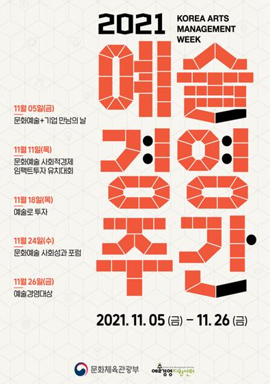 문체부와 예경은 예술경영 정보를 제공하고 기업·기관의 우수사례를 확산해 발전적 예술경영 확산을 도모하고자 지난해부터 ‘예술경영주간’을 추진하고 있다. 올해는 단계적 일상 회복을 맞이해 예술경영에 관심 있는 기업·단체가 직접 참여할 수 있는 ‘기업 만남의 날’, ‘문화예술 분야 투자 유치 대회’, ‘예술경영대상’ 등 다양한 행사를 진행한다.