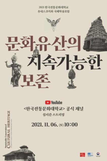 문화재청 한국전통문화대학교는 오는 11월 6일 오전 10시 한국전통문화대학교 대학원종합연구관 문화유산콘텐츠제작스튜디오에서 ‘2021 한국전통문화대학교 유네스코 석좌 국제포럼’을 개최한다.