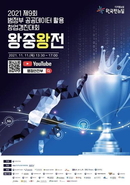 행정안전부는 공공데이터를 활용하는 우리나라 최고의 창업 축제인 「2021 제9회 범정부 공공데이터 활용 창업경진대회 왕중왕전」을 오늘 오후 1시 30분에 시작한다고 밝혔다.