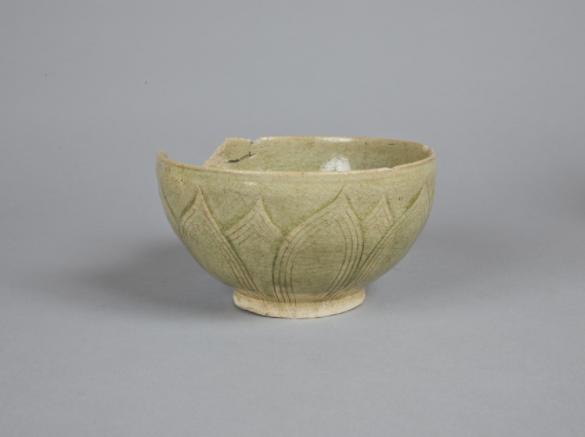 안쪽 8개, 바깥쪽 8개의 연꽃잎이 겹쳐져 청자를 감싸고 있는 형태로 오목새김과 돋을새김(음각·양각기법)을 모두 사용하여 입체감이 있으며, 이러한 형태는 5세기 중국 유송(劉宋)대 청자 그릇의 대표 형태이다. 중국 강서성(江西省) 홍주요(洪州窯)에서 제작된 것으로 추정되며 중국 출토품과 비교해도 최상품으로 여겨진다. 국내 유사 사례로는 천안 용원리 고분군 C지구 1호 석실분 출토품을 들 수 있다. 중국에서 출토된 남조의 송(宋)대 402년(영초 원년(永初 元年) 출토품과 474년(원미(元微) 2년) 출토품과 비교·분석한 결과 제작 시기는 474년을 전후한 시기인 5세기 중후반 경인 것으로 추정된다.