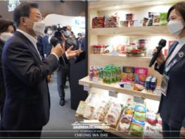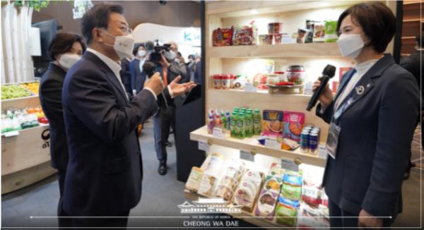 아울러 'K-SEAFOOD관'에서는 육현진 성경식품 총괄 본부장이 "BTS의 다이너마이트 등 노래의 버전을 만들어서 한국의 맛과 연결되는 맛을 만들었다"며 "김치맛 김, 불고기맛 김 등을 올해 9월 출시했는데 정말 놀랍게도 출시를 하자마자 약 30억원 정도의 수주를 했다"는 성공 사례를 전했다. 이를 들은 문 대통령은 "우리나라가 수출 1위인 김을 김 스낵, 김 튀각으로 만들어 간식이나 맥주 안주로 먹고, 우리나라에 여행 온 외국인들이 많이 사 간다고 들었는데, 그런 쪽에 관심을 많이 가지면 좋을 것 같다"는 조언을 건넸다.