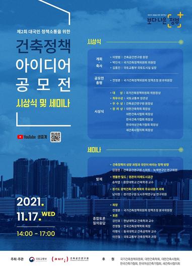 국토교통부는 국민이 공감하고 체감할 수 있는 건축정책을 수립하기 위해 개최한 ‘제2회 건축정책 아이디어 공모전’ 시상식과 함께 건축정책 성과 및 추진방향에 대한 세미나를 11월 17일 오후 2시 온라인으로 개최한다고 밝혔다.