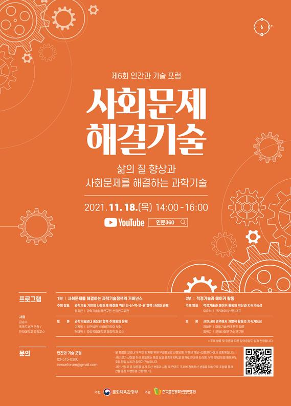 문화체육관광부는 한국출판문화산업진흥원과 함께 11월 18일 오후 2시, ‘사회문제 해결기술 – 삶의 질 향상과 사회문제를 해결하는 과학기술’을 주제로 여섯 번째 ‘인간과 기술 포럼’을 개최한다.
