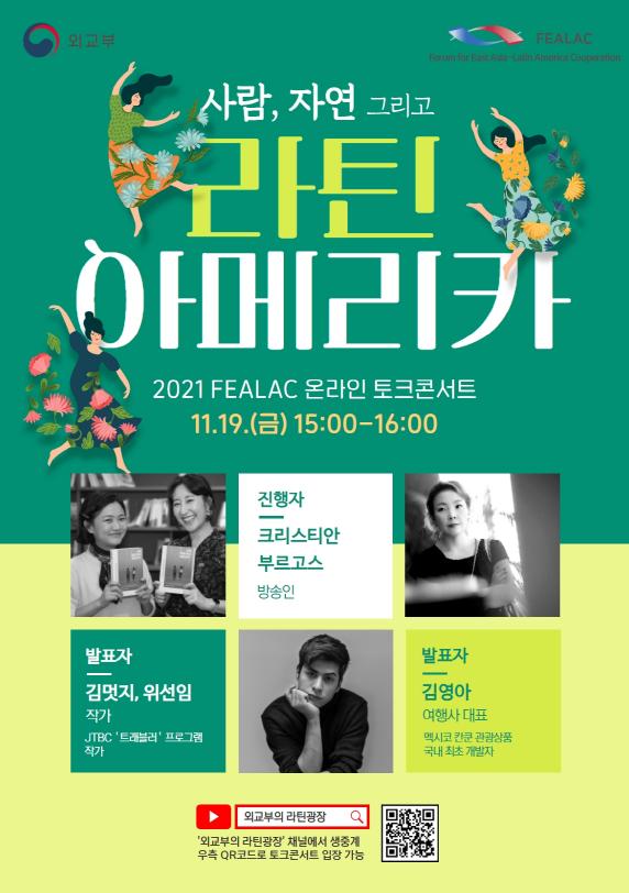 외교부는 동아시아-라틴아메리카 협력포럼(FEALAC) 협력사업의 일환으로 11.19. 15:00~16:00 「사람, 자연 그리고 라틴아메리카」 온라인 토크콘서트를 개최한다.