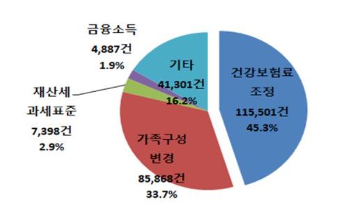 이의신청 사유는 ‘건강보험료 조정’이 115,501건(45.3%)으로 가장 많았고, ‘출생 등 가족구성원 변경’ 85,868건(33.7%), ‘재산세 과세표준 이의’ 7,398건(2.9%) 순이었다.
