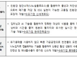 1탄 대상을 수상한 ‘(주)에이앤폴리’는 최근 화두인 ESG(환경·사회·지배구조개선) 경영 확산에 따른 친환경·생분해 밀키트 포장재에 목재에서 추출한 나노셀룰로오스 성분을 활용한 고기능, 생분해성 포장재 개발기술을 제시하여,
