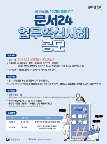 행정안전부는 11월 22일부터 12월 3일까지 문서24 서비스를 활용한 정부와 기업의 업무혁신 아이디어 공모전을 개최한다.