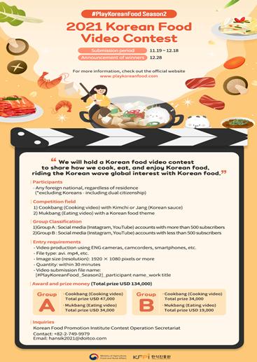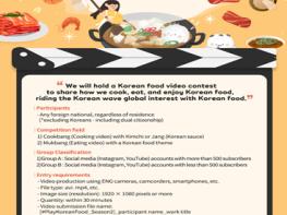 농림축산식품부와 한식진흥원은 해외 한식 확산을 위해 2021년 11월 19일부터 한 달간 ‘외국인 대상 한식 영상 공모전’을 진행한다.