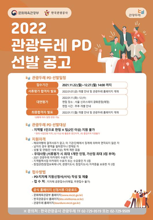 문화체육관광부는 한국관광공사와 함께 11월 22일부터 29일까지 ‘2022년도 관광두레 피디(PD)’를 모집한다.