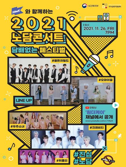 보건복지부는 11월 26일 오후 7시, 1020세대가 함께 참여하는 온라인 노담(No담배) 콘서트를 K-POP 유튜브 채널 ‘원더케이(1theK)’에서 최초 공개한다고 밝혔다.