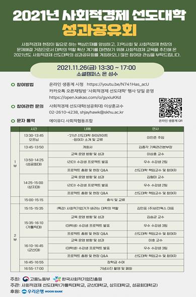 고용노동부와 한국사회적기업진흥원이 주최하고, 사회적경제 선도대학협의회가 주관하는 「2021 사회적경제 선도대학 성과공유회」가 11월 26일, 소셜캠퍼스온 서울1센터(서울 성동구)에서 개최됐다.