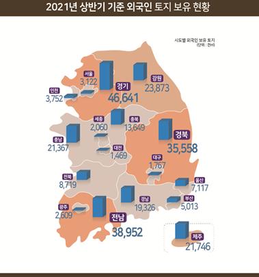국토교통부는 ‘21년 상반기 기준 외국인이 보유한 국내 토지면적은 256.7㎢(2억 5,674만㎡)으로, 전 국토면적(100,413㎢)의 0.26% 수준이라고 밝혔다.