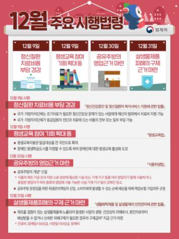 법제처는 12월에 총 118개의 법령이 새로 시행된다고 밝혔다. 주요 시행법령의 내용과 시행일은 다음과 같다.