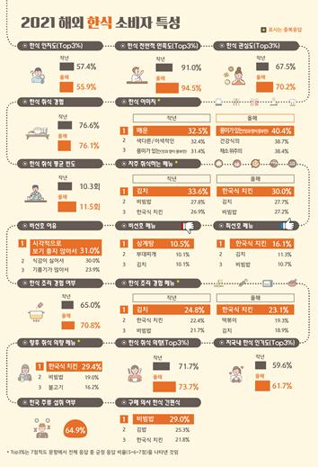 농림축산식품부와 한식진흥원은 2021년 8월부터 9월까지 해외 주요 17개 도시에 거주 중인 현지인 8,500명을 대상으로 해외 한식 소비자 조사를 실시하였다.