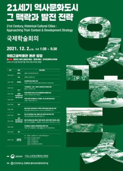 문화재청은 한국건축역사학회와 함께 ‘21세기 역사문화도시, 그 맥락과 발전 전략’을 주제로 오는 12월 2일 국립고궁박물관 강당에서 국제학술대회를 개최한다. 문화재청과 한국건축역사학회 유튜브에서도 생중계한다.