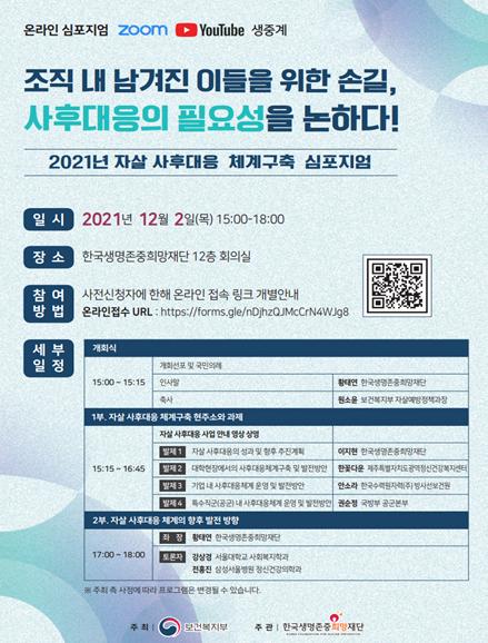 보건복지부와 한국생명존중희망재단은 12월 2일 오후 3시 한국생명존중희망재단(서울시 중구 소재)에서 「2021 자살 사후대응 체계구축 학술대회」를 개최했다.
