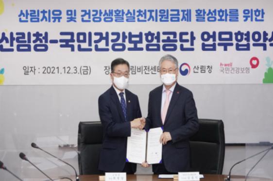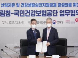 산림청과 국민건강보험공단은 12월 3일 여의도 산림비전센터에서 ‘산림치유 및 건강생활실천지원금제 활성화’를 위한 업무협약을 체결했다.