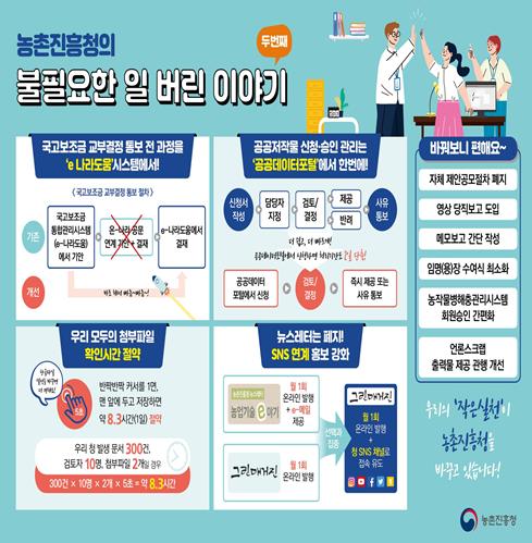 농촌진흥청은 조직문화 및 일하는 방식 개선 계획을 수립하고, ‘불필요한 일 버리기 65과제’를 발굴해 적극 추진했다.