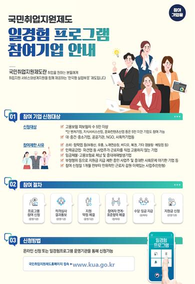한편, 국민취업지원제도 일경험프로그램은 '22년 25,000명 규모(체험형 7,500명, 인턴형 17,500명)로 진행하며, 참여자들에게 내실 있는 일경험을 제공할 수 있는 대·중견기업, 공공기관 등을 상시 모집하고, 큐아르 코드(QR)를 활용한 출결관리 시스템을 도입하여 참여기업의 참여자 관리(출결 등) 부담을 완화하면서 참여자에게는 일경험을 통해 취업역량을 강화할 수 있도록 사전 직무교육, 수료 전 피드백 지원 등 내실 있는 일경험이 될 수 있도록 운영할 예정이다.