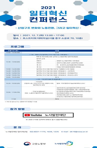 고용노동부와 노사발전재단은 12.7. 13시 30분, 포스트타워(서울 중구 소재)에서 「2021년 일터혁신 컨퍼런스」를 개최했다.