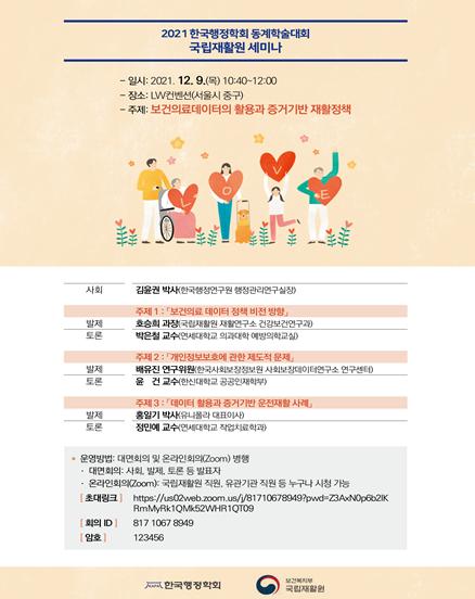 보건복지부 국립재활원은 「2021 한국행정학회 동계학술대회」에서 ‘보건의료데이터의 활용과 증거기반(evidence-based) 재활정책’을 주제로 LW컨벤션(서울 중구)에서 12월 9일 오전 10시 40분 학술대회를 개최한다.