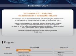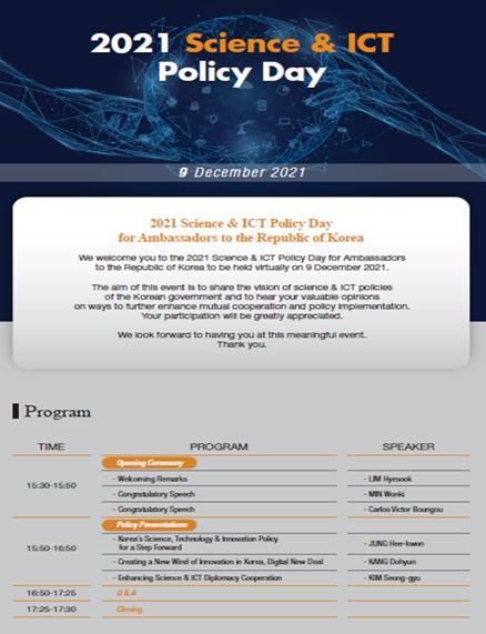 과학기술정보통신부는 12월 9일 오후 3시 30분부터 주한(駐韓) 외교공관 대사, 과학기술ㆍ정보통신기술(ICT) 담당 외교관, 국제기구 대표 등을 초청하여 ‘2021년 주한 외교관 정책 설명회’를 개최했다.