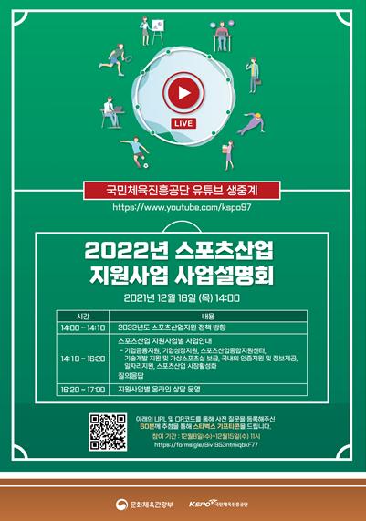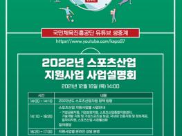 문화체육관광부는 국민체육진흥공단과 함께 12월 16일 오후 2시, ‘2022년 스포츠산업 지원 사업 설명회’를 개최하고 체육공단 유튜브 채널을 통해 온라인으로 생중계한다.