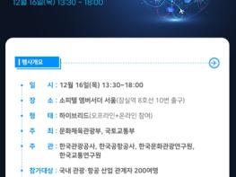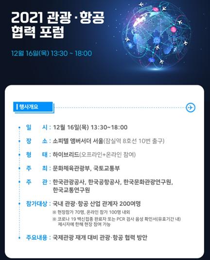 문화체육관광부와 국토교통부는 12월 16일 오후 1시 서울 소피텔 앰버서더 호텔에서 ‘2021 관광·항공 협력 포럼’을 온·오프라인으로 병행해 개최한다. 이번 토론회는 코로나19 예방을 위해 방역수칙을 철저하게 준수한 가운데 현장 참석자를 최소화해 진행하며 누구든지 온라인 신청을 통해 화상회의 방식으로 참여할 수 있다.