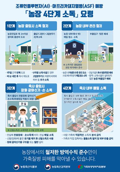 특히, 농장 4단계 소독 요령에 따라 출입 차량 소독과 축사 출입 시 장화 갈아신기·손 소독 등을 철저히 해 줄 것을 다시 한번 강조했다.