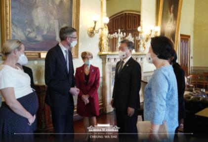 문재인 대통령은 14일 오후(현지시각) 시드니 뉴사우스웨일즈주 주총독 관저에서 마가렛 비즐리(Margaret Beazley) 주총독 부부, 도미닉 페로테(Dominic Perrottet) 주총리 부부와 오찬을 갖고, 한국과 뉴사우스웨일즈주 관계 증진 및 코로나 이후 경제 회복을 위한 실질 협력 강화 등에 관해 논의했다.