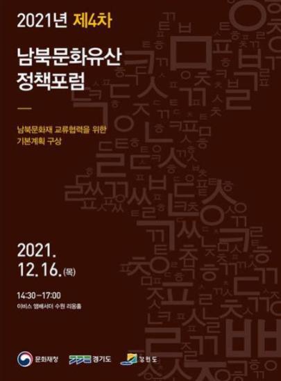 문화재청은 경기도·강원도와 공동으로 16일 오후 2시 30분, 경기도 수원시 이비스 앰배서더 수원에서 ‘2021년 제4차 남북문화유산 정책포럼’을 개최한다.