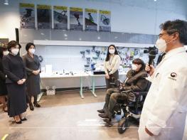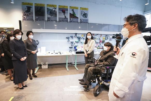 열린제작실에서는 전동휠체어를 이용하는 신상경 씨를 만났다. 전동휠체어로 지하철을 타고 내릴 때 뒤를 돌아볼 수 없어 다른 사람들에게 불편과 위험을 초래한 경험을 바탕으로 직접 국립재활원에 ‘후방카메라’ 제작을 요청한 신상경 씨의 이야기에 김정숙 여사는 “국가가 (국립재활원을 통해) 주도적으로 장애인들의 재활 치료를 돕고 장비를 제작해 준다는 것이 참 중요한 것 같다”고 소회를 덧붙였다.