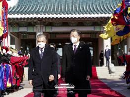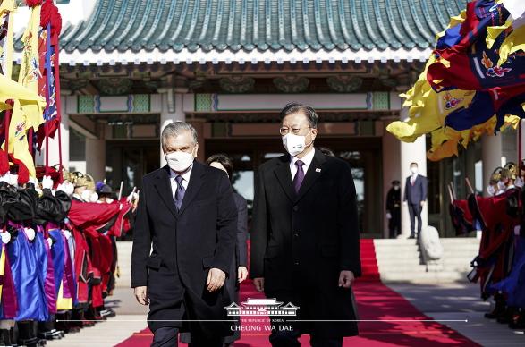 문재인 대통령은 17일 오전 청와대 대정원에서 우즈베키스탄 샤브카트 미르지요예프(Shavkat Mirziyoyev) 대통령 부부를 맞이하며 공식환영식을 열었다.