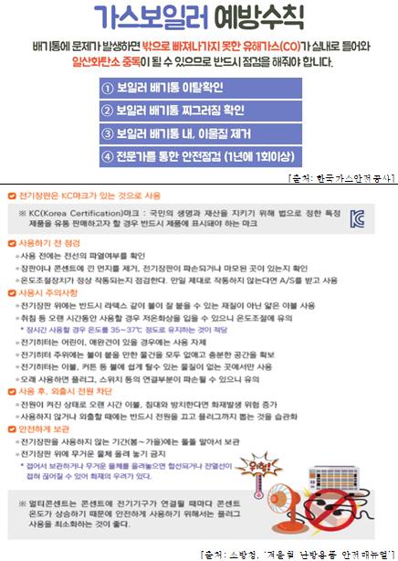 고광완 행안부 예방안전정책관은 “각 가정에서는 가스보일러 가동 전 점검은 물론이고 보일러에 이상이 없는지 주기적으로 확인하고, 보조 난방기를 사용할 때는 과열을 방지하기 위해 단독 콘센트를 사용하는 등 각별한 주의가 필요하다.”라고 말했다.