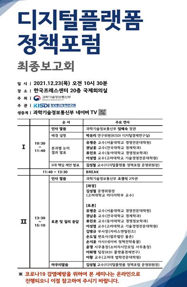 디지털 플랫폼 정책포럼은 플랫폼을 둘러싼 이러한 이슈들을 종합적으로 조망하기 위해 4개 분과를 구성하여, 실효성 있는 대안 마련을 위해 노력해왔으며, 다각적인 논의의 결과물을 오늘 최종보고회에서 발표했다.