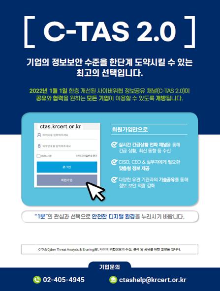 한국인터넷진흥원(KISA)은 `21.12.24.부터 “사이버위협정보 분석·공유시스템 2.0, 간편 가입환경”을 제공하여 기업이 손쉽게 가입할 수 있도록 할 예정이며, 가입을 원하는 모든 기업은 사이버위협 분석·공유시스템 누리집(ctas.krcert.or.kr)을 통해 가입절차를 진행하면 된다.