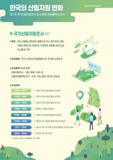 국가산림자원조사는 국가승인통계로 산림자원의 현황 및 시간 경과에 따른 변화정보를 제공하기 위하여 1974년부터 우리나라의 산림자원을 5년마다 조사하였으며, 본 보고서는 제7차 국가산림자원조사 자료를 분석한 결과이다.