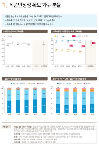 식품안정성 확보 가구 분율은 ‘18년(기준치) 96.9%에서 ‘20년 96.3%로 감소하였고, 건강식생활실천, 포화지방산 적정 섭취, 칼슘 적정 섭취 또한 감소했다.