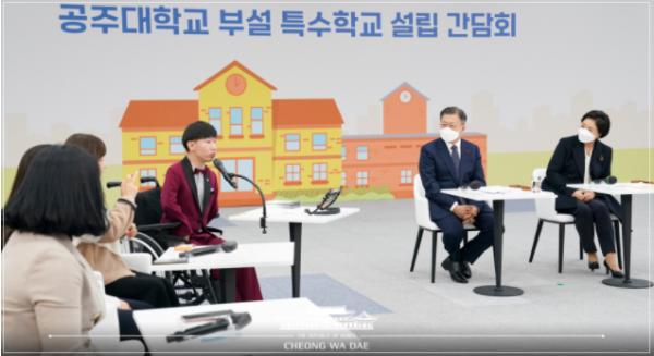 문재인 대통령은 오늘 오전, 공주대학교 부설 특수학교 설립 간담회 및 기공 행사에 참석해 “국립대학이 가지고 있는 전문성이 있는 교육자원과 연계하여 재능 있는 장애 학생들에게 특화된 교육과정을 운영할 수 있는 첫 사례가 될 것”이라고 밝혔다.