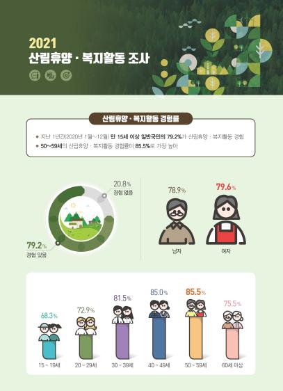 코로나 19로 인한 외부활동 자제 영향으로 산림휴양·복지활동 경험률은 2019년보다 소폭 하락했으며(81.4% → 79.2%), 학교에서의 특별활동 감소 영향으로 15세~19세 이하 하락 폭(76.5% → 68.3%)이 전 연령대 중 가장 컸다.