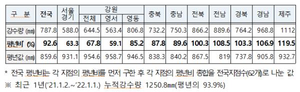 김성중 행정안전부 재난대응정책관은 “최근 누적강수량은 평년보다 다소 적으나, 전국의 저수지?댐의 평균저수율은 평년수준보다 높게 관리되고 있어 용수공급은 원활할 예정이다.”라며, “2022년 임인년에도 전국에 정상적으로 용수가 공급될 수 있도록, 관계부처와 지속적으로 협력하여 나가겠다.”라고 밝혔다.