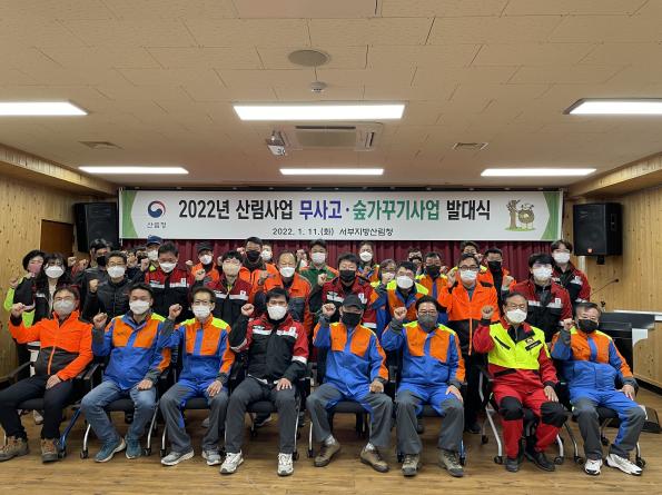 서부지방산림청은 2022년 숲가꾸기사업의 활력을 불어넣고 산림재해 걱정없는 안전한 산림사업장을 만들기 위해 1월 11일(화) 국유림영림단과 담당공무원 등 38여명이 참석한 가운데 ‘산림사업 무사고 · 숲가꾸기사업 발대식’을 가졌다.
