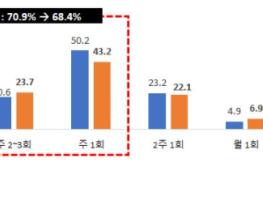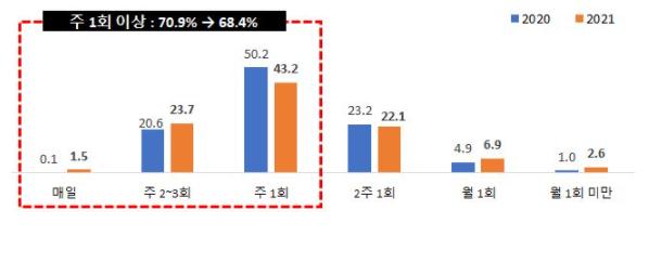 ??가공식품 구입 주기는 ‘주 1회 구입한다’라고 응답한 가구가 43.2%로 가장 많이 차지하였다. 전년과 비교하여 주 1회 이상 구입 가구의 비율은 소폭 감소(’20:70.9% → ’21:68.4)하였으나, 주 2~3회 구입 가구의 비율은 증가(’20:20.6% → ’21:23.7)하였다. 세부적으로는 가구원 수가 많을수록, 월평균 가구소득이 높을수록 구입 주기가 짧은 것으로 나타났다.